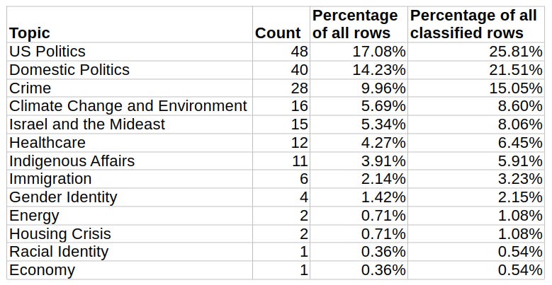 I then (mostly) manually classified the other 186 stories using nine topics. Here’s how those broke down: