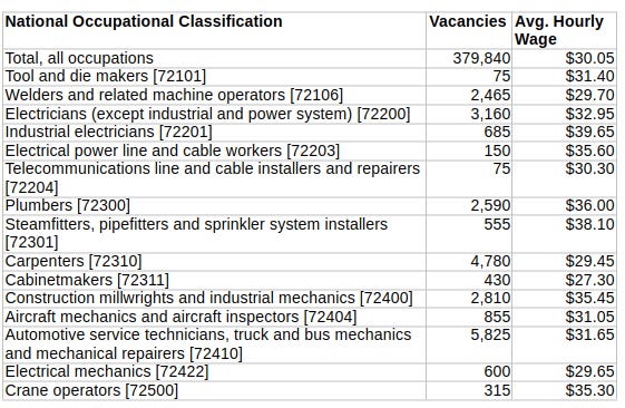 The available numbers for some trades (like elevator mechanic) were considered “too unreliable to be published”. But there are many dozens of categories in that Statistics Canada dataset that are available (and you can filter by province). It’s a shame this particular resource isn’t better known.