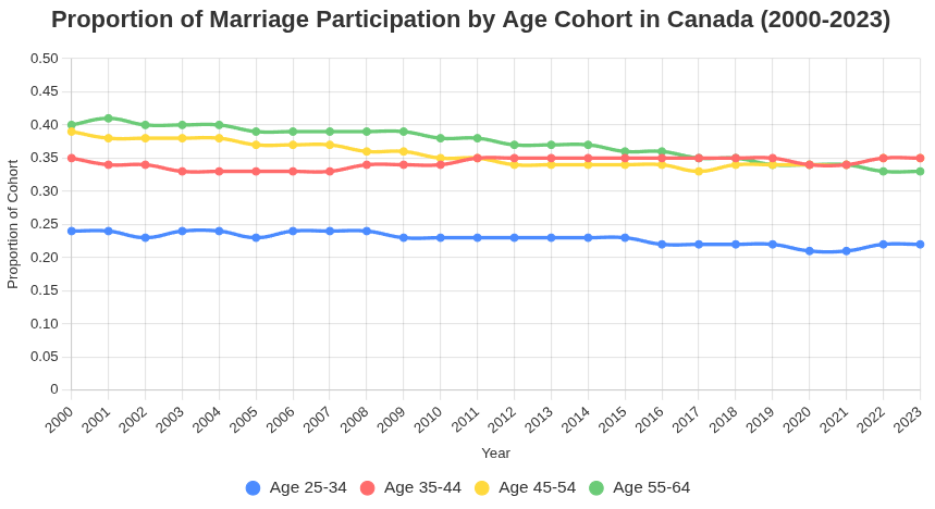 More recently, the housing affordability crisis seems to be forcing younger Canadians to delay their marriage plans. This could have led to more stable relationships (while at the same time contributing to suppressed birth rates).