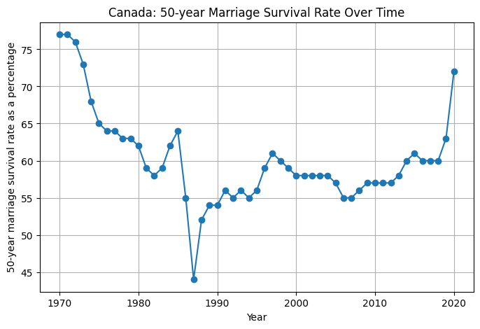 And the 50-year total divorce rate1 has been visibly dropping. Put differently, the percentage of couples whose marriages did not end in divorce before their fiftieth anniversary (i.e., the inverse of the 50-year total divorce rate) has been trending upwards for the best part of a decade now: