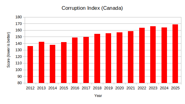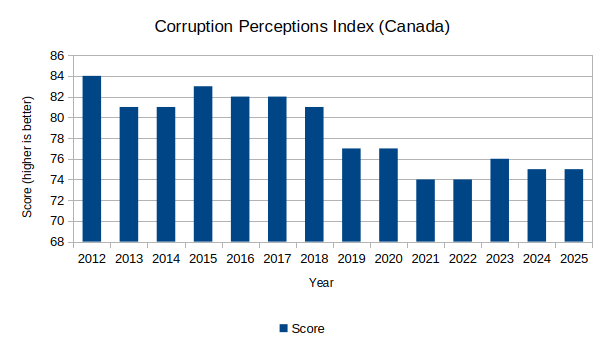 The steady decline is obvious. For context, Canada’s international CPI ranking fell from ninth place in 2012 to 16th in 2025. So the decline isn’t just following along with a global phenomenon. In fact, according to Transparency International’s notes, “31 countries have significantly reduced their corruption levels since 2012.”