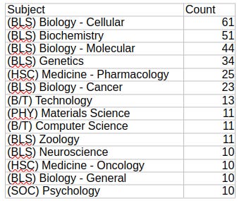 For those of you keeping track at home, there were 1,263 individual authors involved in those 218 questionable papers. None of them had more than five such papers and only a very small handful showed up in four or five cases. Although there would likely be value in looking a bit more closely at their publishing histories.