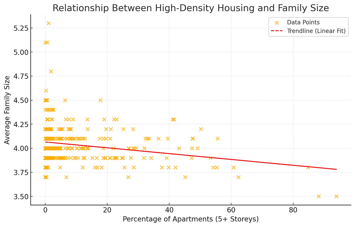 The correlation coefficient between the percentage of apartments in buildings with five or more storeys and the average family size is approximately -0.224. This indicates a weak negative correlation, suggesting that as the proportion of high-density housing increases, the average family size slightly decreases. But the relationship is not strong enough to suggest a clear, reliable pattern. This scatter plot shows us the results: