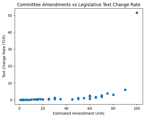 TCR is measured by adding together the count of words added with words removed and dividing that by total words of the first reading version. The higher the TCR score, the greater the scope of the changes to the bill along its journey to law.