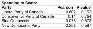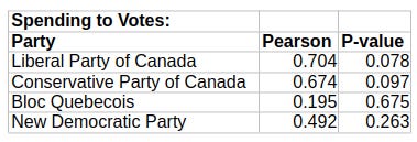 The only result that came even close to significant was the relationship between Liberal spending and votes: