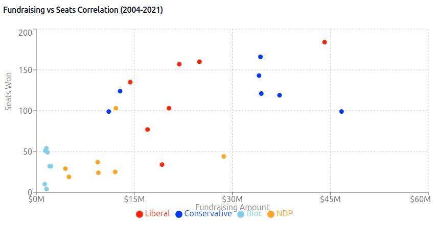 That’s the big picture. But what I’m really hoping to find is some indication that funding actually makes a difference in the polling booth. Do parties that raise more money tend to receive more votes and win more seats?