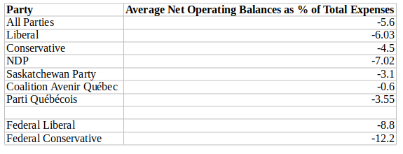 Now let’s see how our deficit percentage measure plays out across provincial governments. The next table will more or less conform to expectations. The Conservative parties (which, for convenience, includes the federal Conservative party, along with various Progressive Conservative parties and Alberta’s United Conservative party), along with the Saskatchewan Party and Coalition Avenir Québec have relatively low rates (-0.6 to -4.5 percent). Liberal and NDP governments allowed more spending.