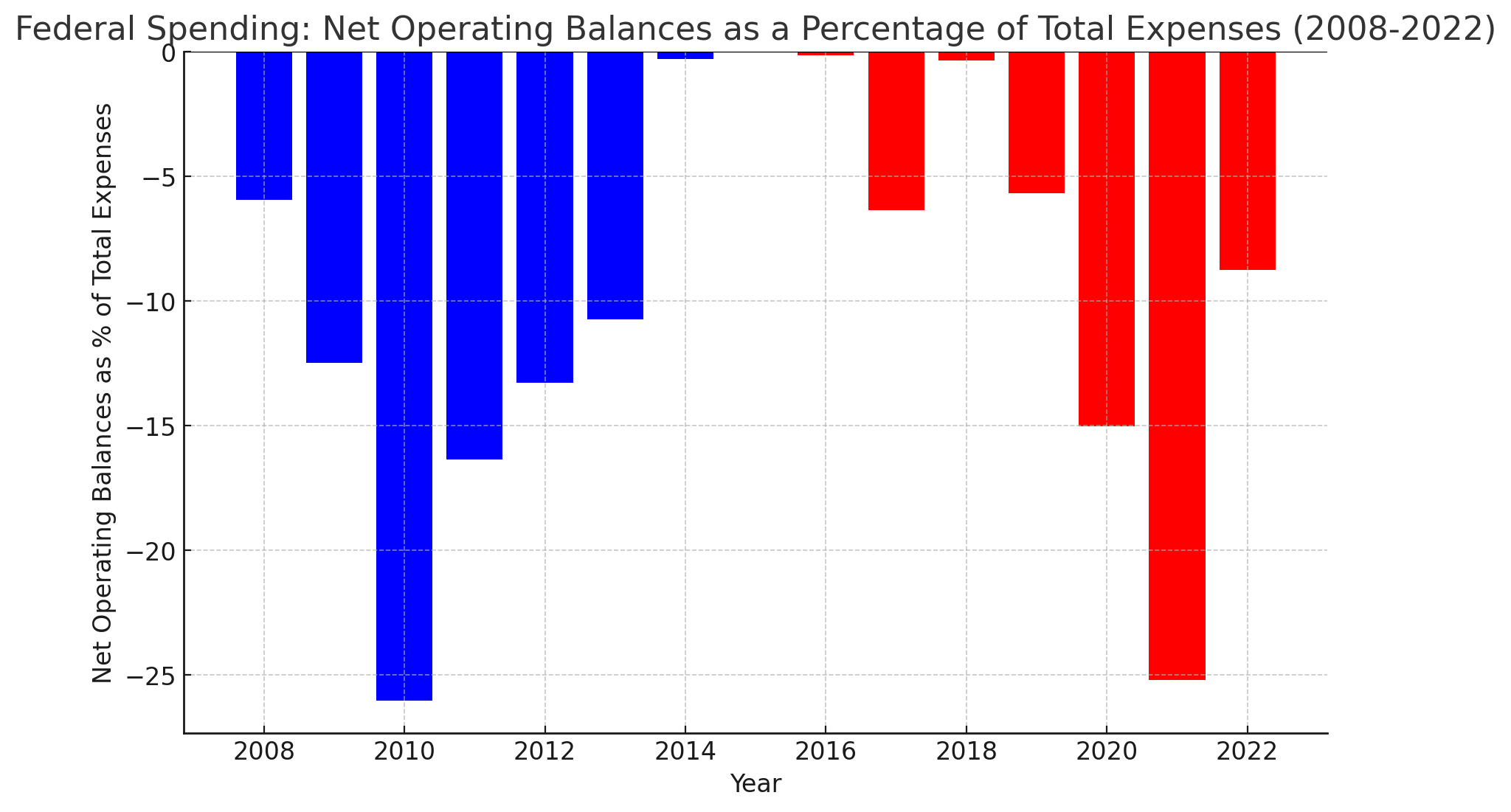 That graph uses federal net operating balances and plots them as a percentage of the total expenses for that year. This serves to normalize the numbers so anomalous economic events won’t distort the results.