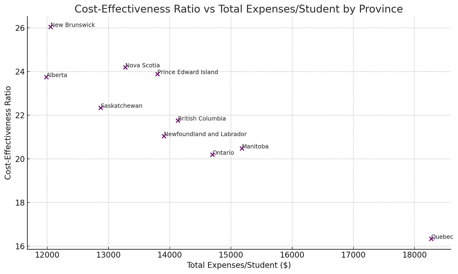 Just to give that a concrete number, the Pearson correlation coefficient between the Cost-Effectiveness Ratio and Total Expenses per Student is -0.92, with a p-value of 0.00017 - indicating that this correlation is statistically significant.