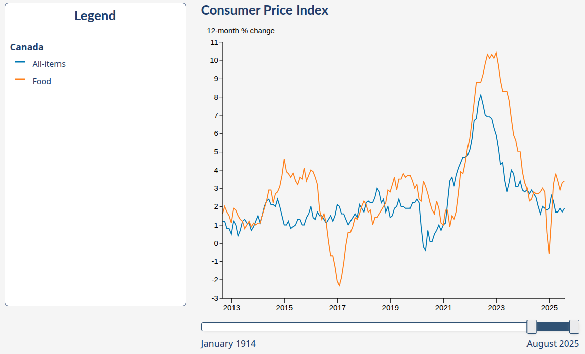 Sure, food prices have been rising. Here’s a screenshot from Statistics Canada’s Consumer Price Index price trends page. As you can see, the 12-month percentage change of the food component of the CPI is currently at 3.4 percent. That’s kind of inseparable from inflation.