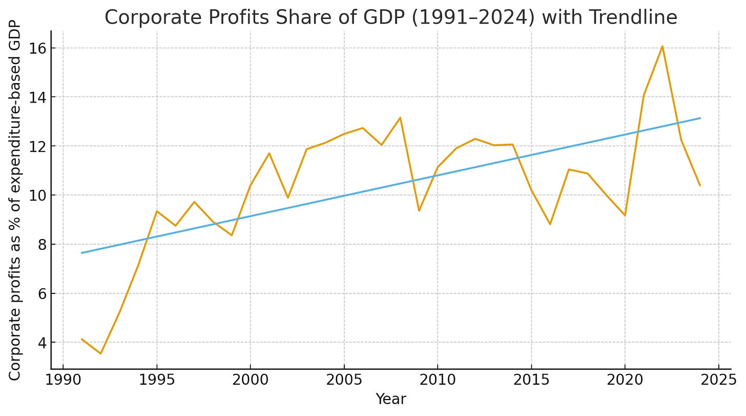 But that post-2020 surge is historically unprecedented. Canada saw an unusually profit-heavy recovery where firms, particularly in resource sectors, captured a large share of national income. There were record margins in energy, finance, and real estate; supply-chain bottlenecks that allowed firms to raise prices faster than costs; commodity price spikes (after the global reopening); and some wage suppression due to limited labor bargaining power.