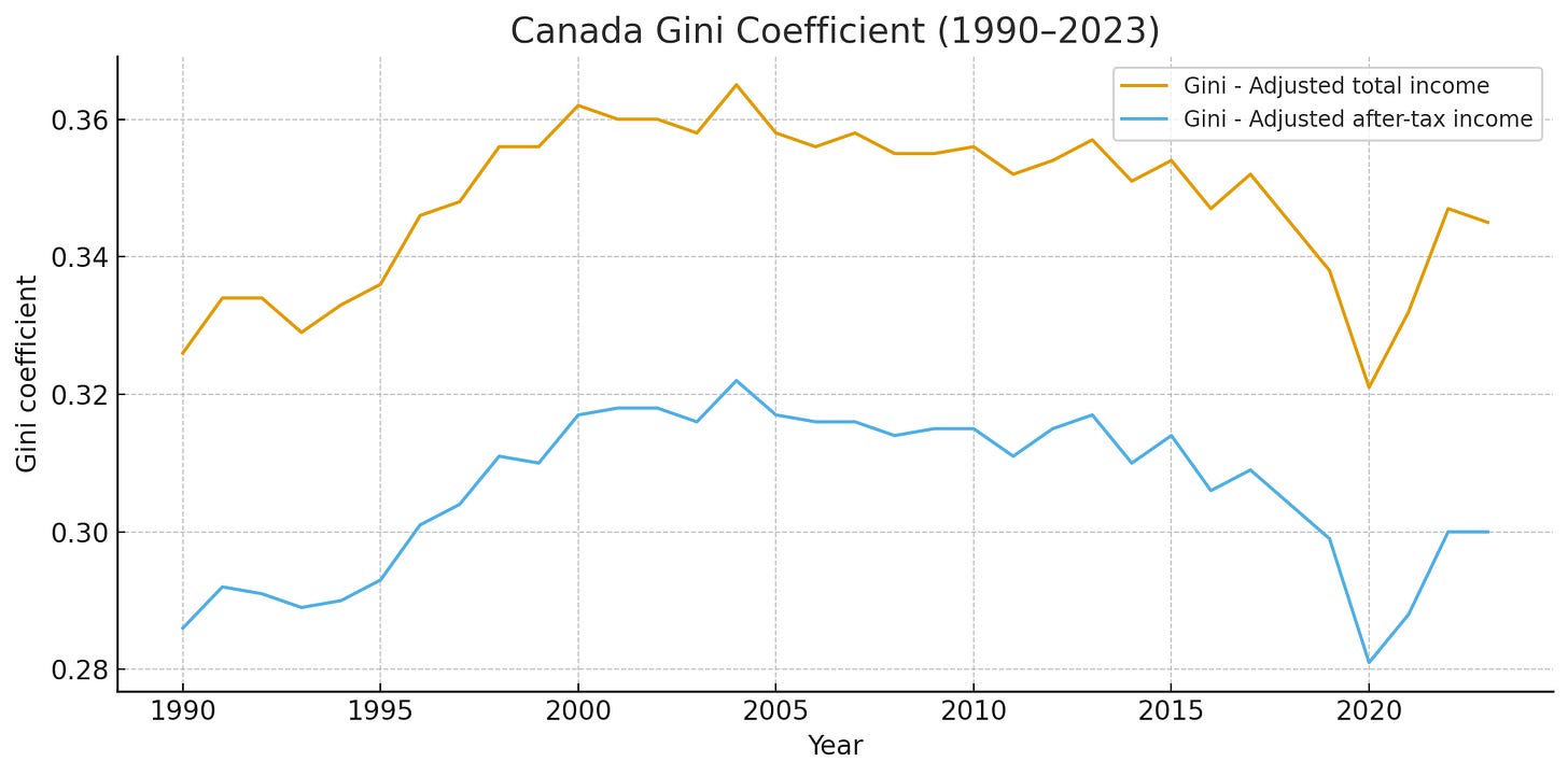 The Gini Coefficient is a pretty good tool for measuring income disparity. A score of “one” would indicate all income flows to a single person, while “zero” would indicate that all wealth is shared equally by everyone. Shifts in Gini values over time can suggest developing trends. Here, based on Statistics Canada data, is what that looks like in Canada: