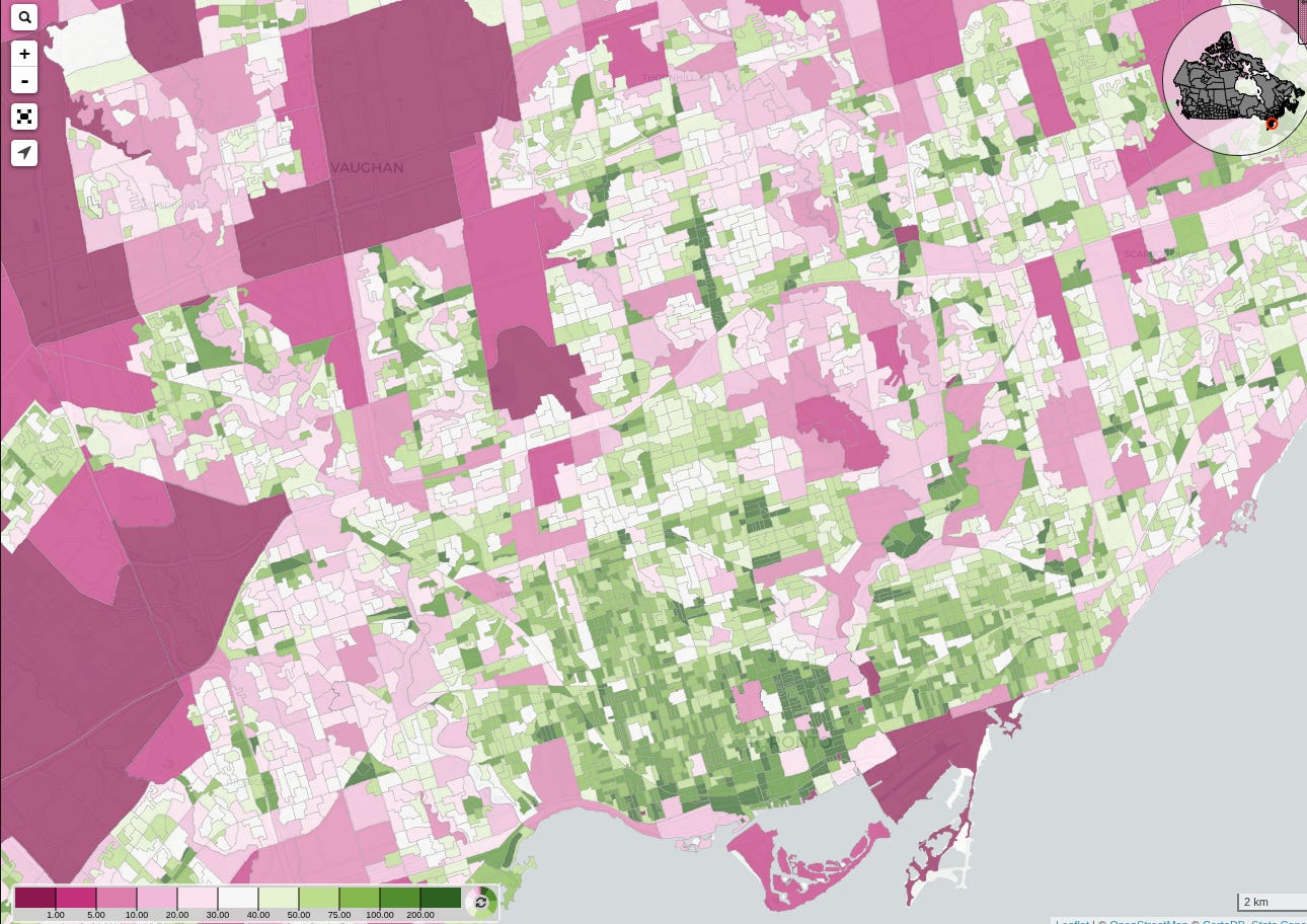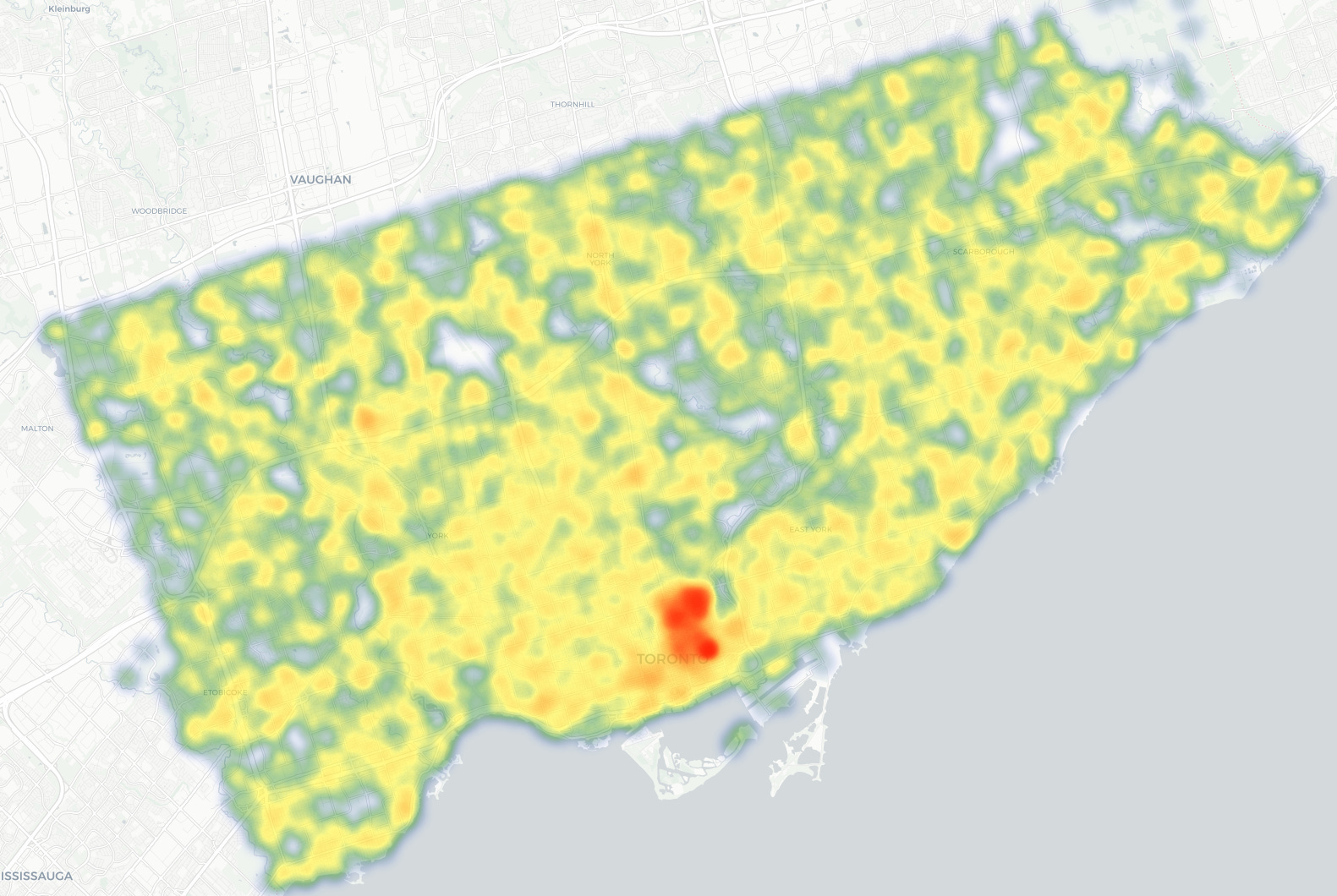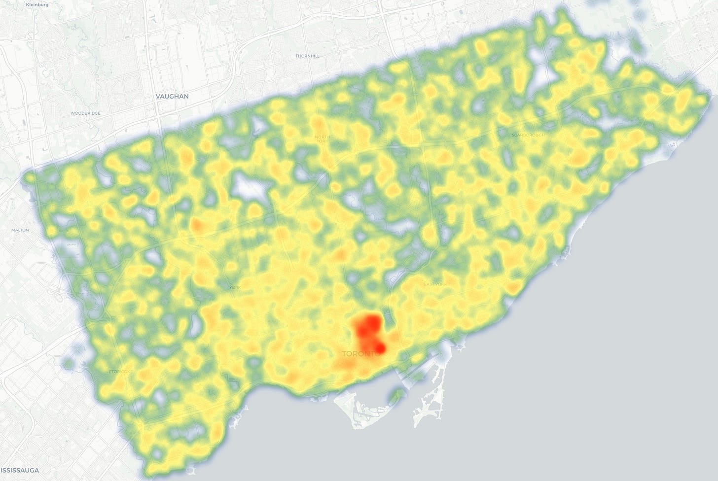 However that’s clearly not true. That fire event visualization isn’t a great match with the following map of Toronto’s population density in 2016 (taken from the CensusMapper.ca site). You can see significant pockets of 200+ people per hectare (colored dark green) well outside the core. I can easily identify the “condo-row”strip of Yonge St. between Sheppard and Finch as one example.