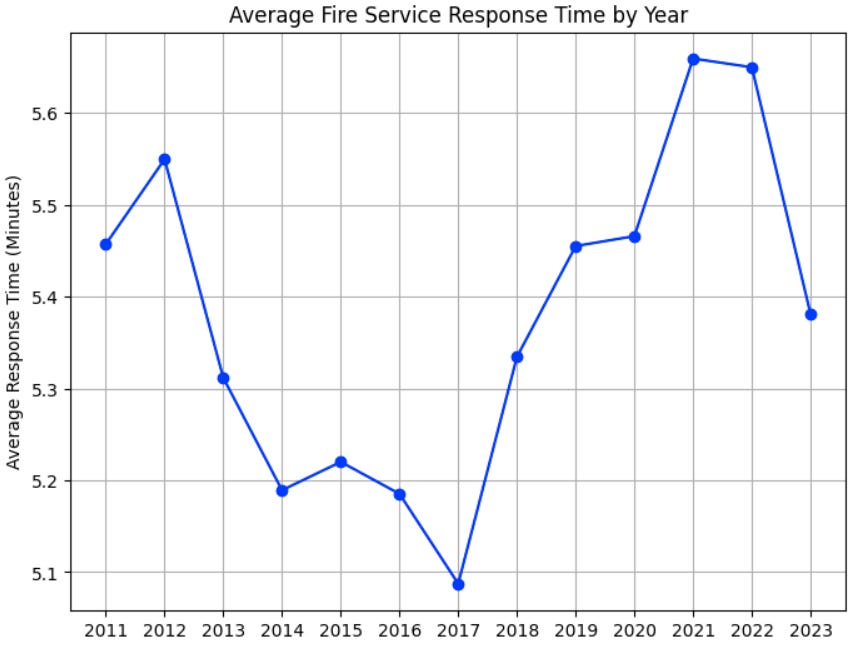 Those relatively quick response times are probably one reason that Toronto firefighters are trained to provide first responder emergency medical assistance. By contrast, the 2023 average response time for Toronto Paramedic Services was approximately eight minutes for sudden cardiac arrests and over nine minutes for other severe emergencies.
