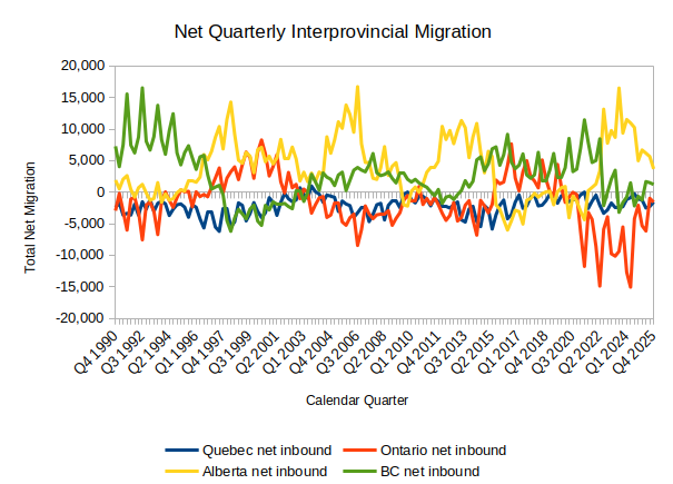 As you should be able to see from the graph, people left Quebec in significant numbers in nearly every quarter since 1990. Ontario, by contrast, enjoyed some popularity between 1997 and 2002, and again between 2016 and 2020. Since 2020, Ontario has been struggling, losing as many as 25,000 people in a single quarter.