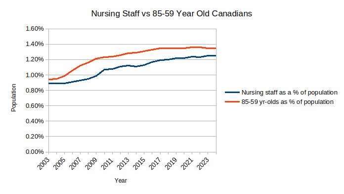 Let’s take a closer look at staffing. According to Statistics Canada, there were 282,818 individuals employed by nursing and residential care facilities in 2003. By 2024, that number had risen 83 percent to 516,898.