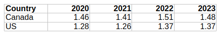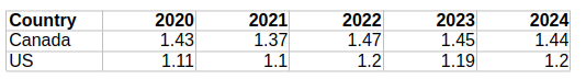 This first table compares the OECD’s household final consumption expenditure for Canada to U.S. numbers. By way of explanation, in 2024 - relative to OECD prices - it took 1.44 Canadian dollars to purchase what 1 USD could buy in terms of household consumption. The disparity hasn’t changed all that much over the five years for which we have data: